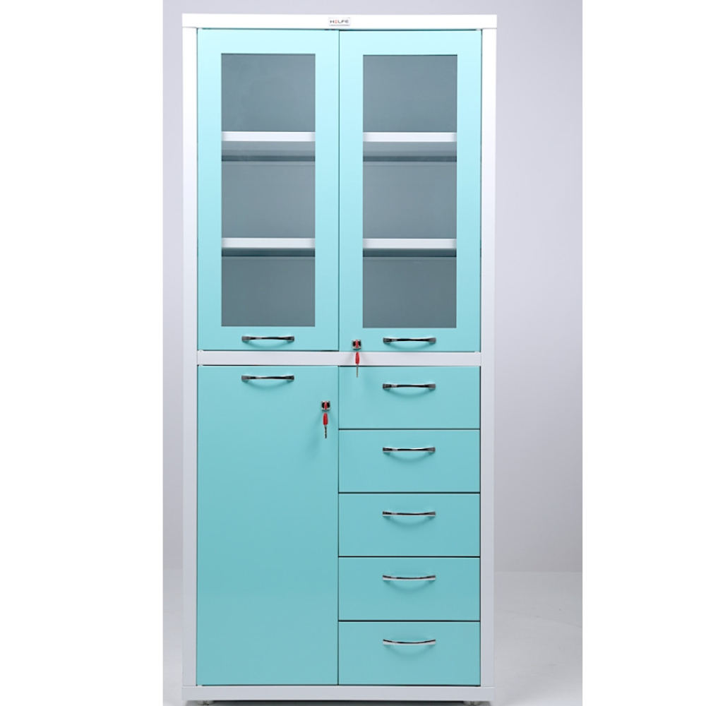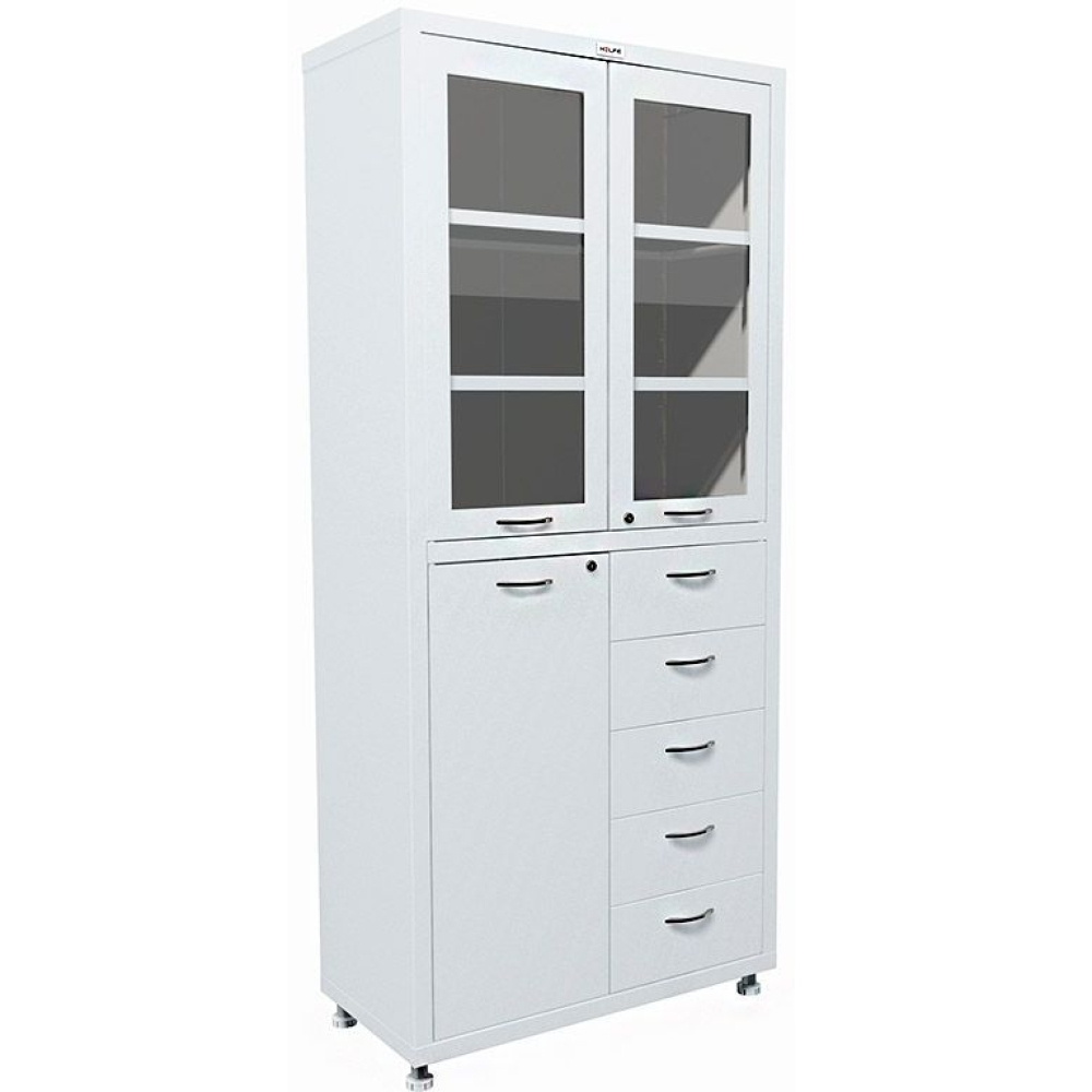 Шкаф медицинский HILFE MD 2 1780 R-5 изготовлен из стали толщиной 0,7 мм и покрыт порошковой краской. Верхний отдел со стеклянными полками оснащен двойной распашной дверью из стали и каленого стекла. Нижний отдел оборудован пятью вертикально расположенными выдвижными ящиками и тумбой с дверкой. Двери верхнего отдела и тумбы оснащены ключевыми замками. На ножках установлены регулируемые по высоте опоры.