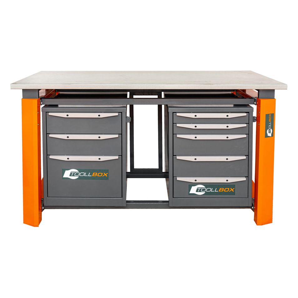 Столешница выполнена из фанеры толщиной 30 мм и сверху закрыта листом оцинкованной стали 1,2 мм. Такое сочетание дает надежную рабочую поверхность, устойчивую к повседневной нагрузке, ударам, трению и постоянному контакту с инструментом. Глубина столешницы 750 мм позволяет комфортно разместить заготовки, оборудование и все, что требуется в процессе работы, не жертвуя свободным пространством.
