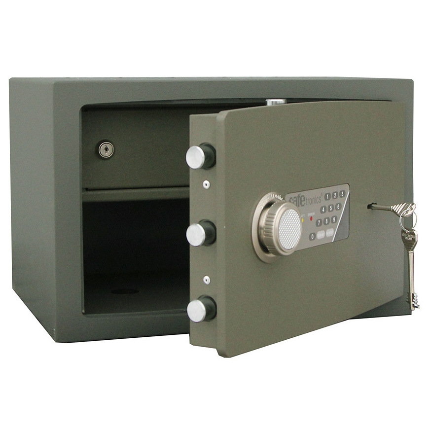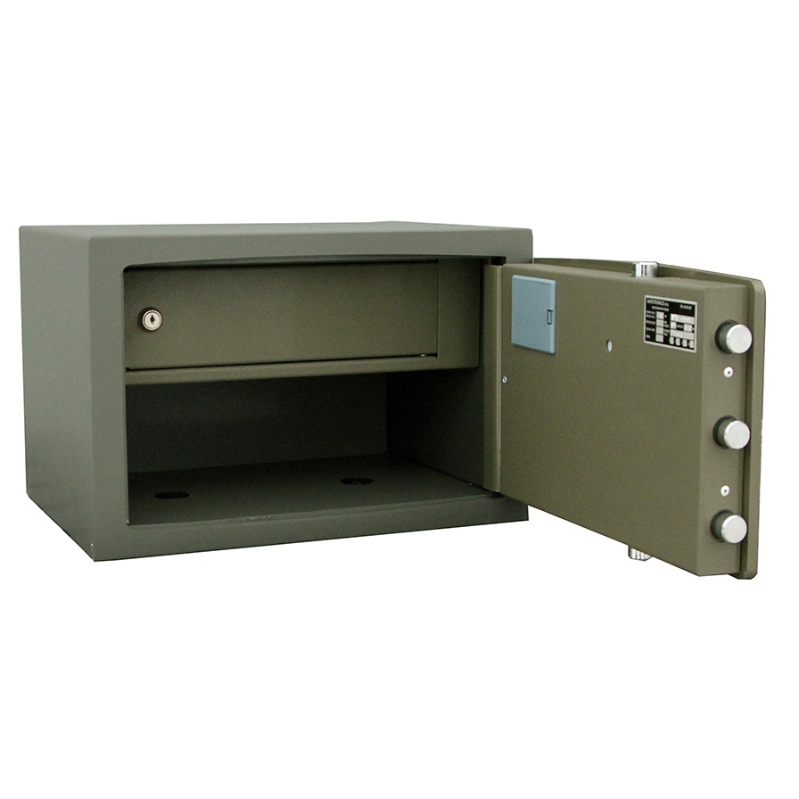 Толщина лицевой панели составляет 10мм. Задняя и боковые стены состоят из двух слоев стали толщиной 3мм и специального материала SMREKOLIT толщиной 10мм, и, благодаря этому, данная серия сейфов соответствуют 1 классу защиты от взлома и обеспечивают начальную защиту от пожара. Взломостойкие сейфы серии NTR оснащаются кодовыми механическими замками LA GARD (США), ключевыми MAUER (Германия), электронными замками SAFEtronics (Словакия). Область замка сейфов защищена двумя пластинами из маргонцевистой стали, защищающими замок сейфа от высверливания. Сейфы серии NTR сертифицированы по европейскому стандарту EuroVDS (Германия), чешскому CSN-9160010 и российскому ГОСТ Р-50862-96 - 1 классу защиты от взлома. Глубина сейфа указана без учета ручки.